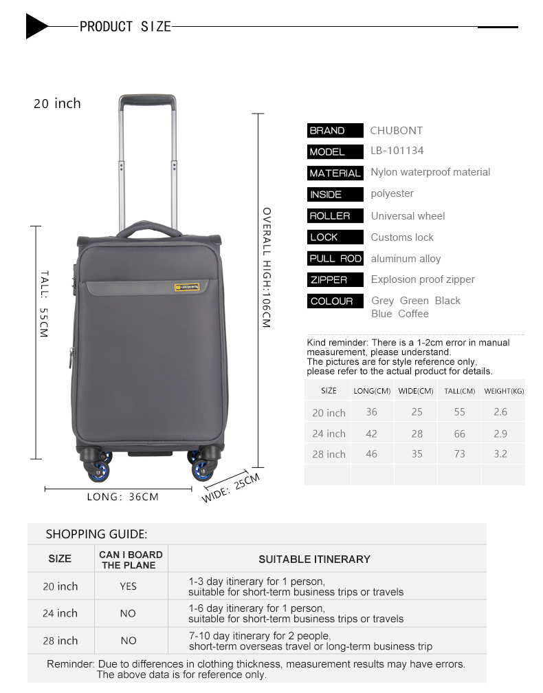 | 20 inch | YES | 1-3 day itinerary for 1 person,suitable for short-term business trips or travels |