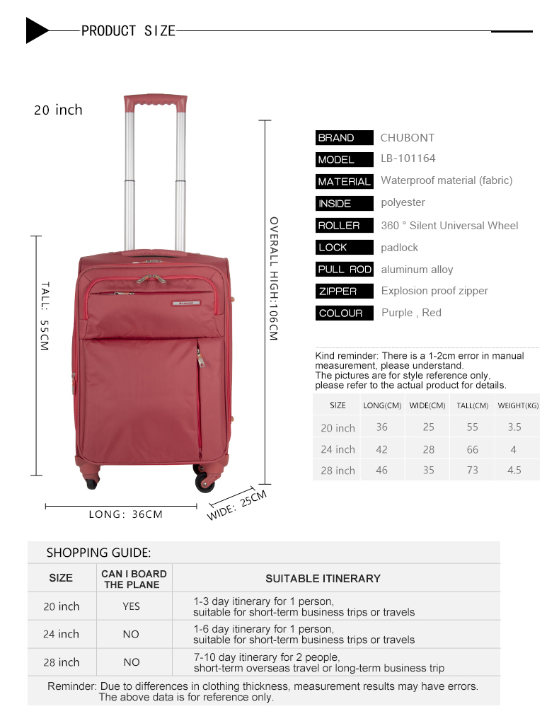 | 20 inch | YES | 1-3 day itinerary for 1 person,suitable for short-term business trips or travels |
