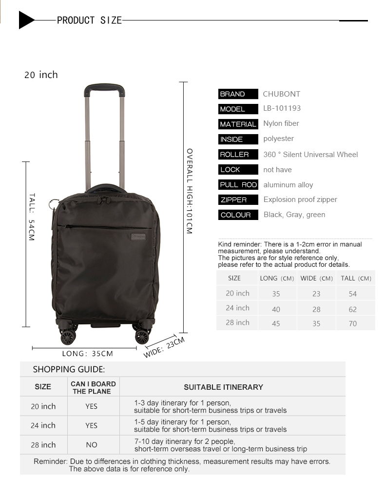 | 20 inch | YES | 1-3 day itinerary for 1 person,suitable for short-term business trips or travels |