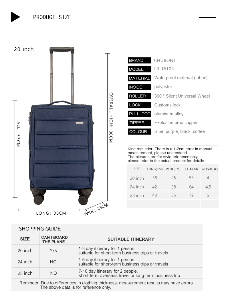 | 20 inch | YES | 1-3 day itinerary for 1 person,suitable for short-term business trips or travels |